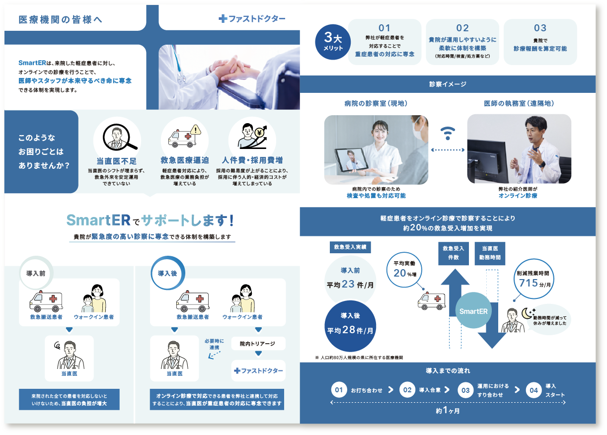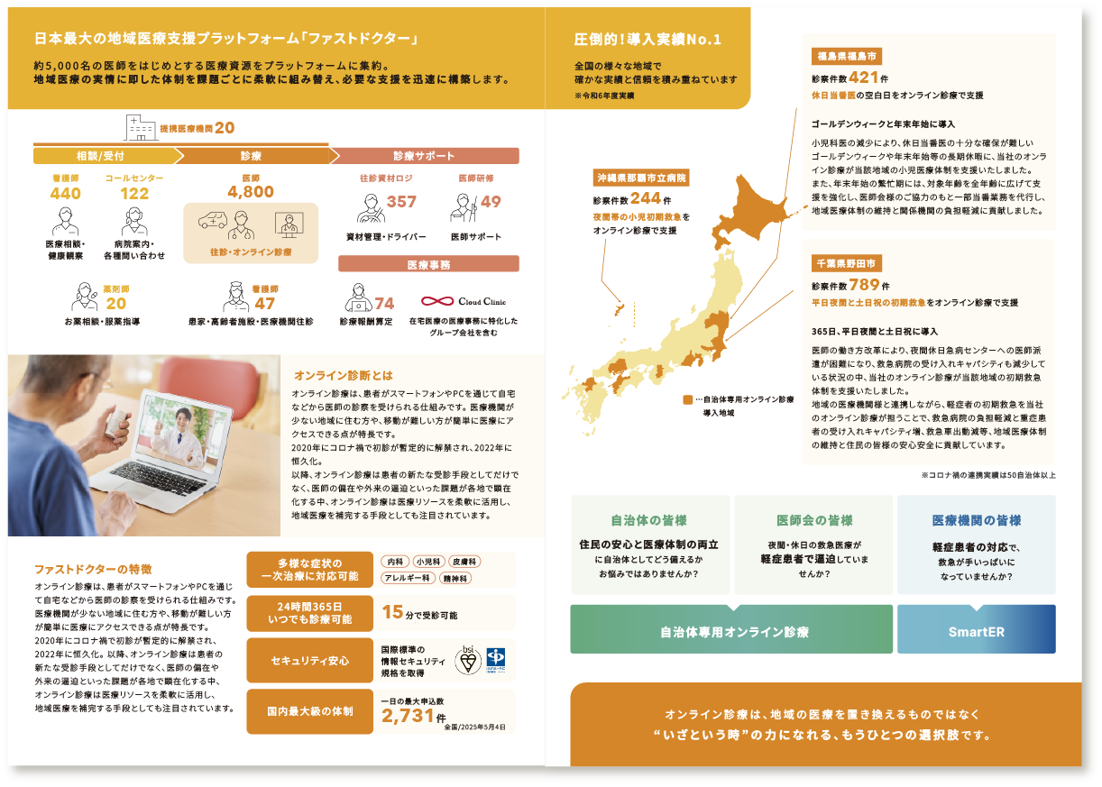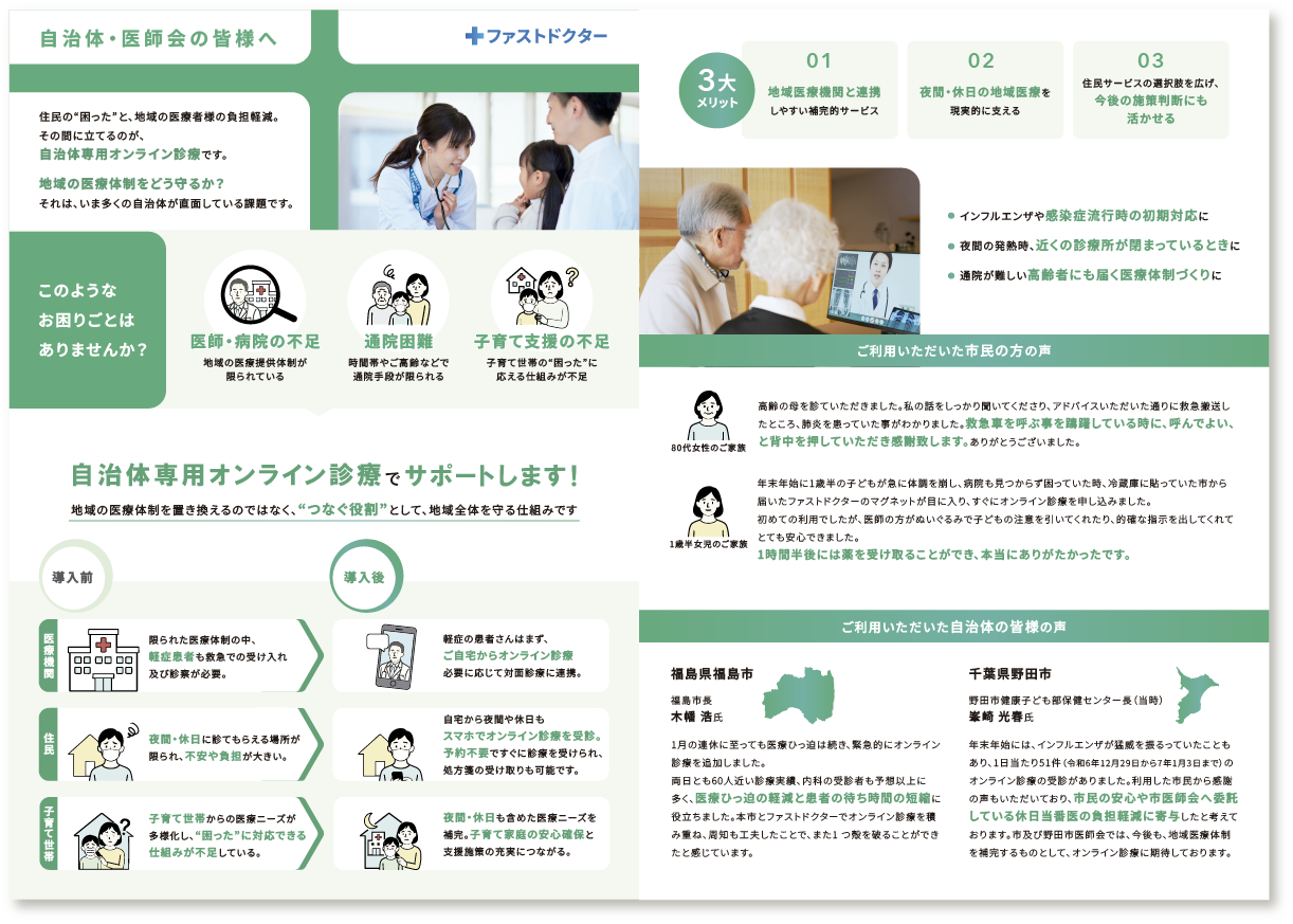 本パンフレットは、地域の医師や自治体関係者を対象に、オンライン診療の役割や導入メリットを伝えることを目的とした配布物です。