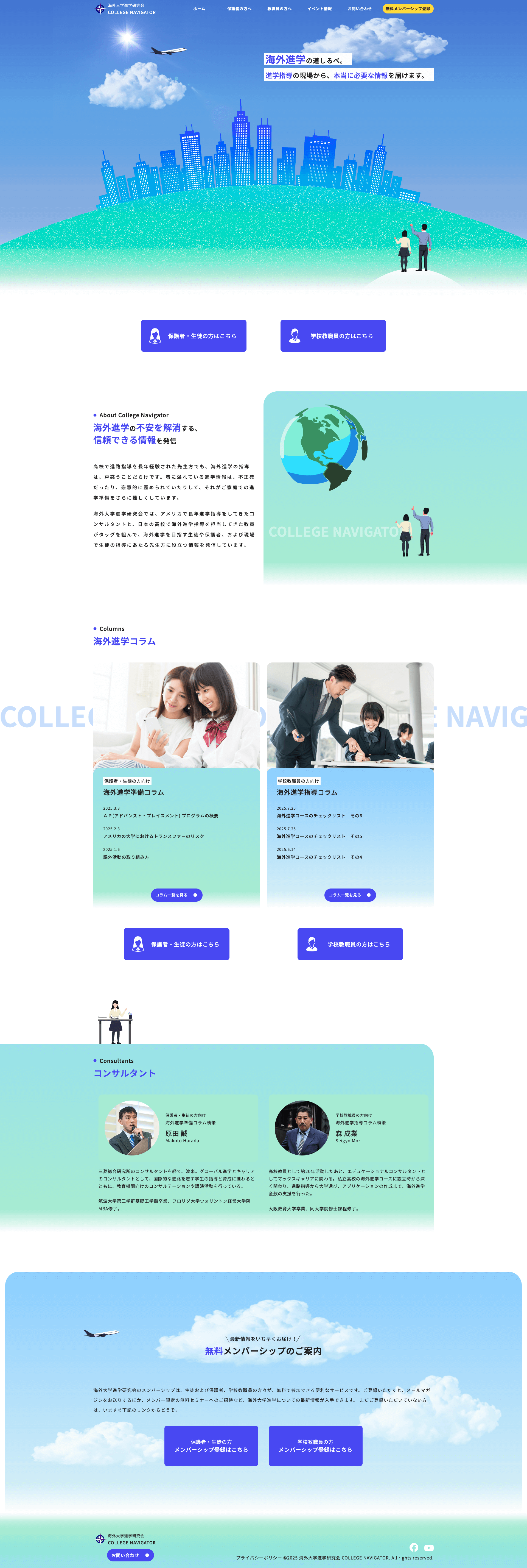 海外の大学進学を目指す学生や保護者に向けて、「未来への希望」を感じられるメインビジュアルを制作しました。
